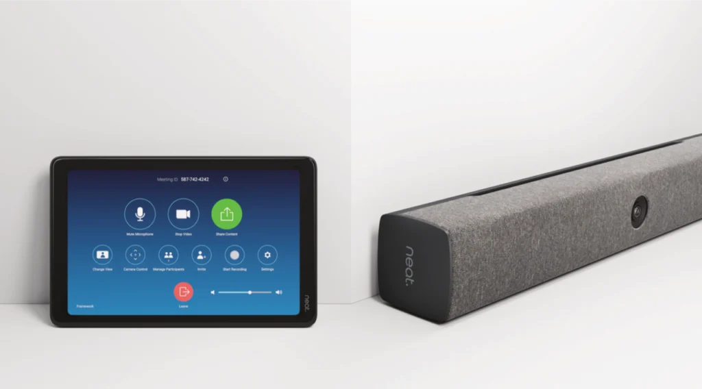 Neat Bar is a simple and elegant, compactly designed yet highly capable meeting room device for Zoom or Microsoft Teams. It's perfect for bringing superior-quality audio and video to your meeting, huddle or focus rooms for up to ten people. You can mount Neat Bar above or below one or two monitors, and it comes with Neat Pad, our dynamic touch screen, which you can use to control your meetings or display room availability outside the room.